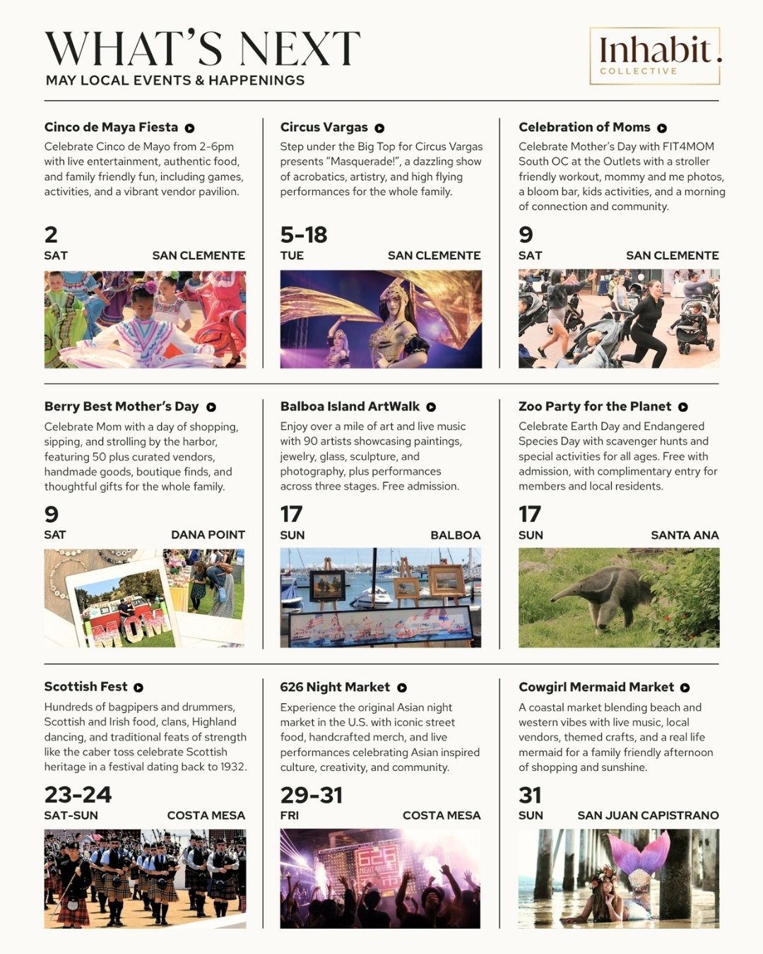 From Cinco de Mayo festivities in San Clemente to art walks along Balboa Island, from circus tents rising near the coast to night markets and cultural festivals in Costa Mesa, the month carries a sense of openness—of community unfolding in new and familiar ways.