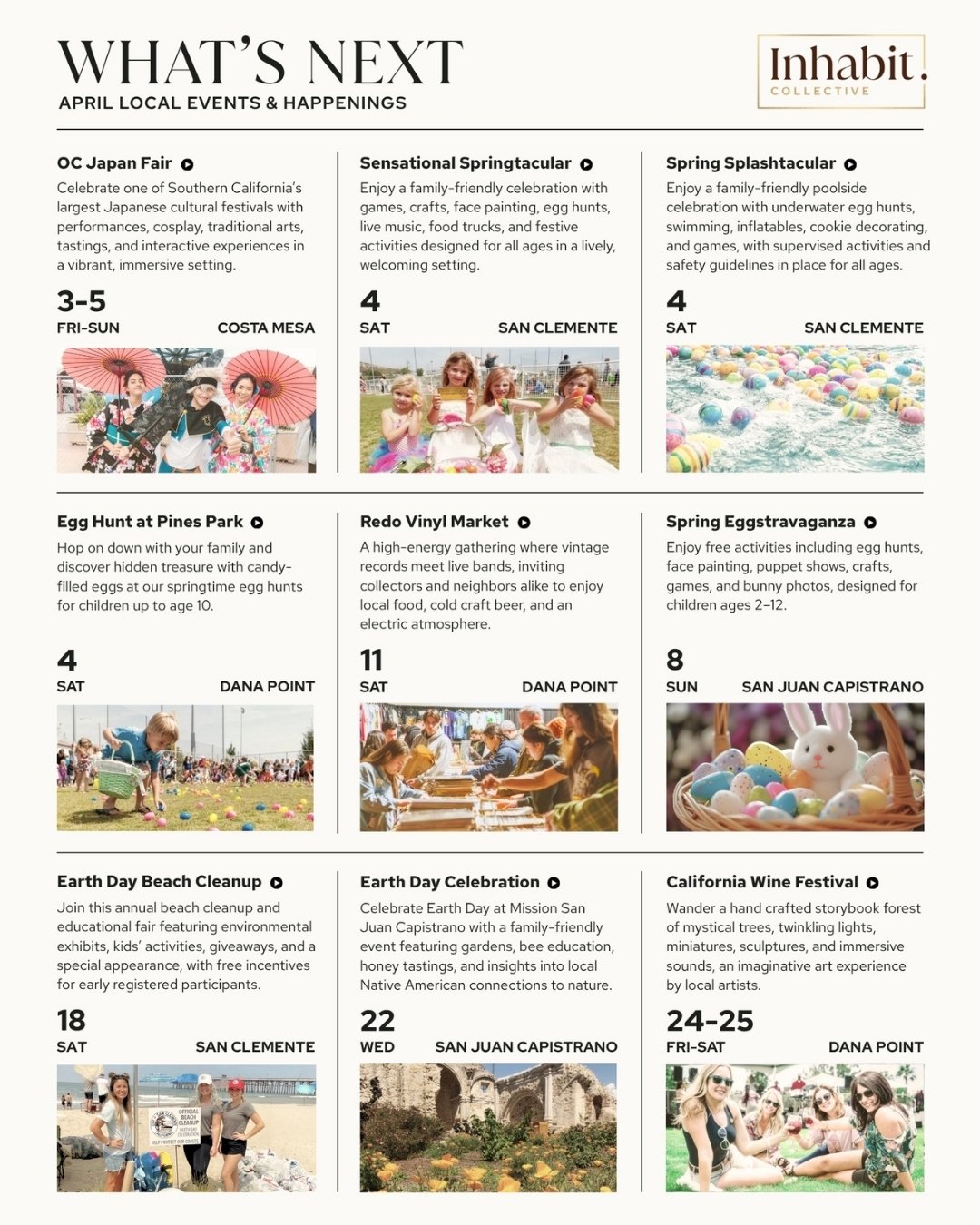 Across the Coastal Collective, April is marked by ritual and return. Egg hunts tucked into neighborhood parks. Spring festivals unfolding across San Clemente. Cultural celebrations in Costa Mesa. Vinyl spinning in Dana Point. Evenings shaped by food, music, and shared experience.