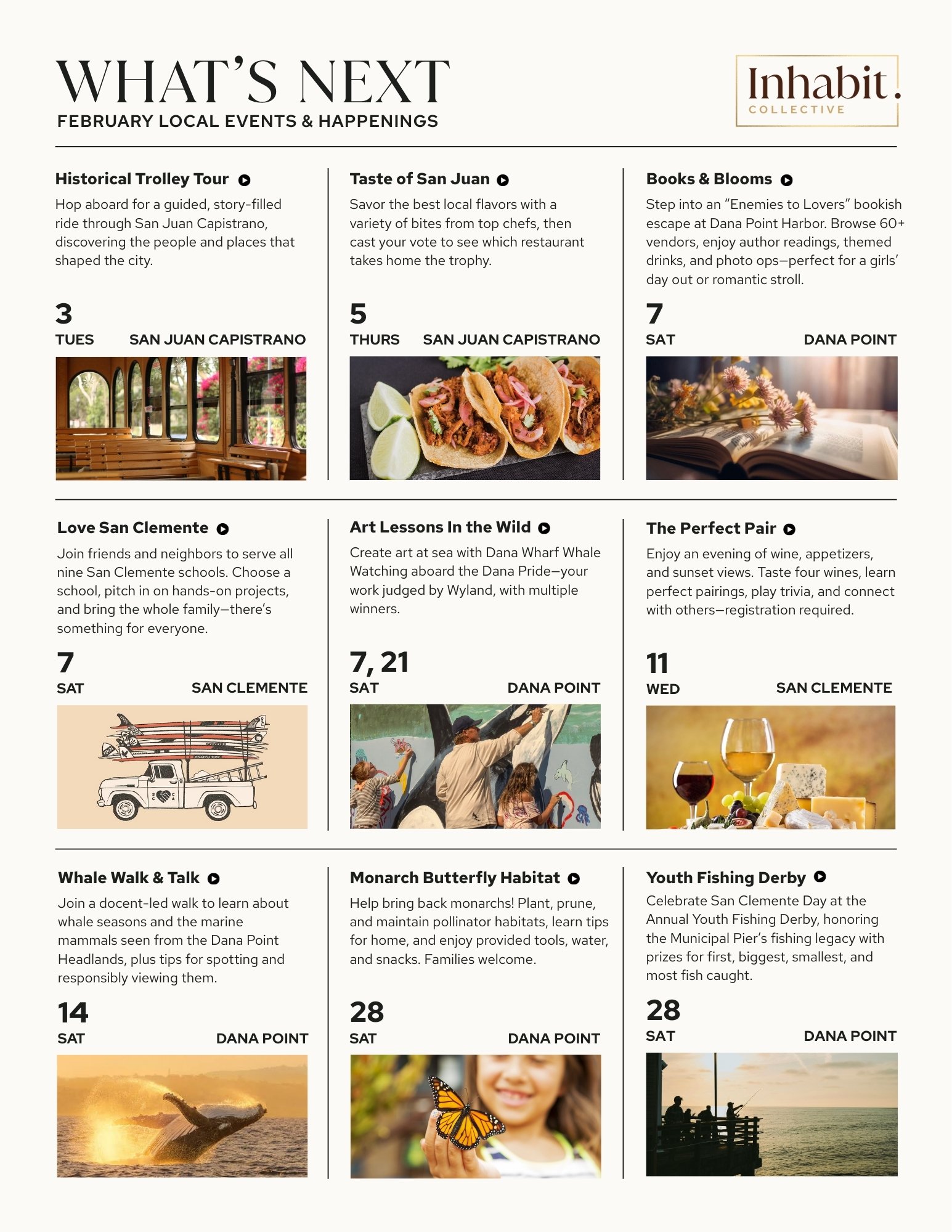 This month’s calendar stretches across the Coastal Collective—from San Clemente to Dana Point to San Juan Capistrano—offering moments that are both playful and grounding. There are watercolor classes aboard a boat, kids fishing derbies at the pier, heritage garden workshops, and food-focused gatherings filled with flavor and connection. Whether you're seeking fresh air, creative inspiration, or just something new to look forward to, February makes space for it.