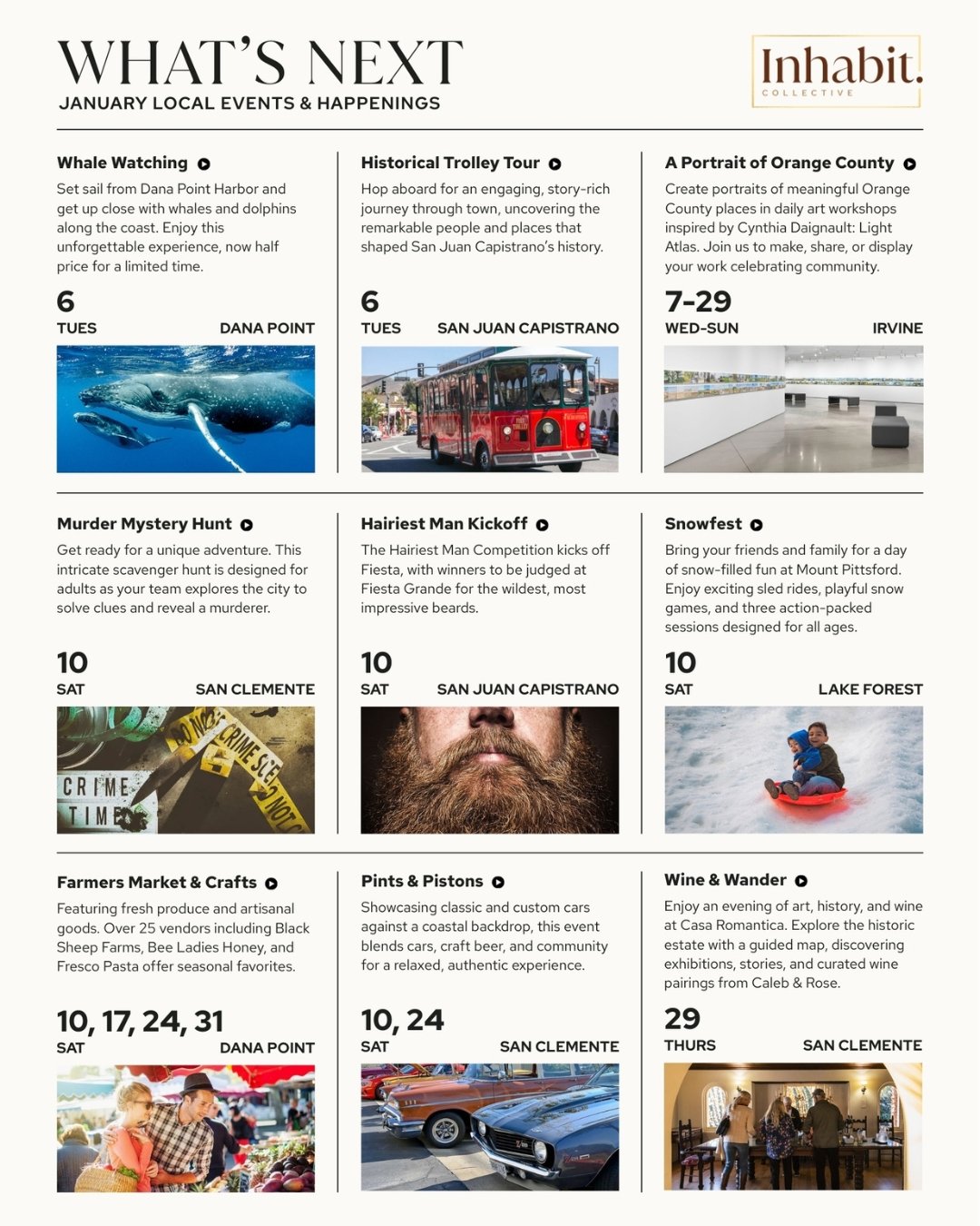 This month’s calendar is filled with moments both playful and purposeful: whale-watching excursions that remind us of the vastness just off our coast, local trolley tours that turn everyday streets into storybook scenes, and cozy markets that reconnect us with the growers, makers, and small businesses that give our towns so much heart. Add in mystery hunts, wine nights, live music, and winter wonder—all set against the backdrop of South Orange County’s coastal charm—and there’s no shortage of ways to feel rooted, inspired, and a little more present.