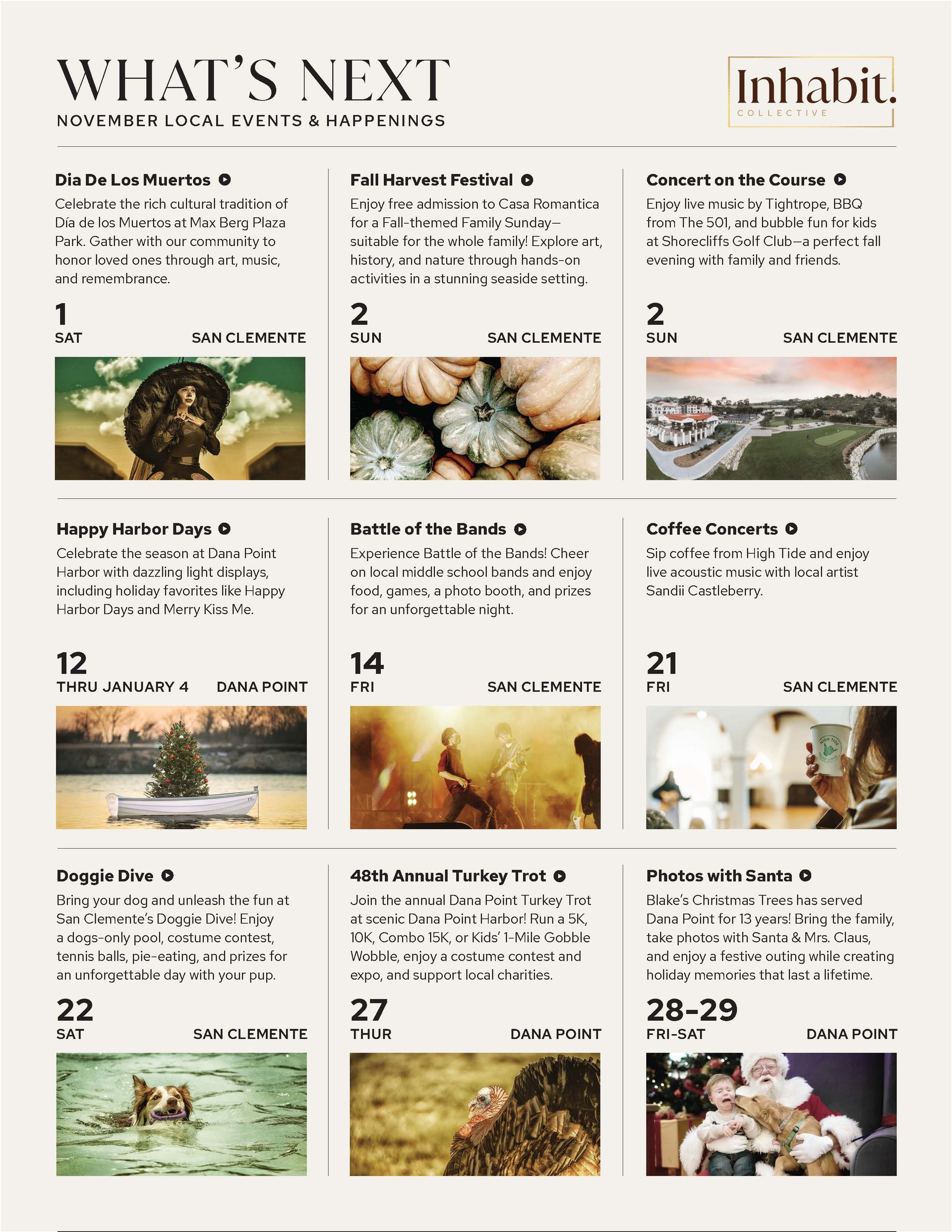 October brings cooler mornings, golden light, and a calendar full of reasons to step outside and connect. This month’s lineup includes everything from food truck gatherings and harbor nights to home tours, spooky traditions, and dog-friendly celebrations across Dana Point, San Clemente, and San Juan Capistrano.