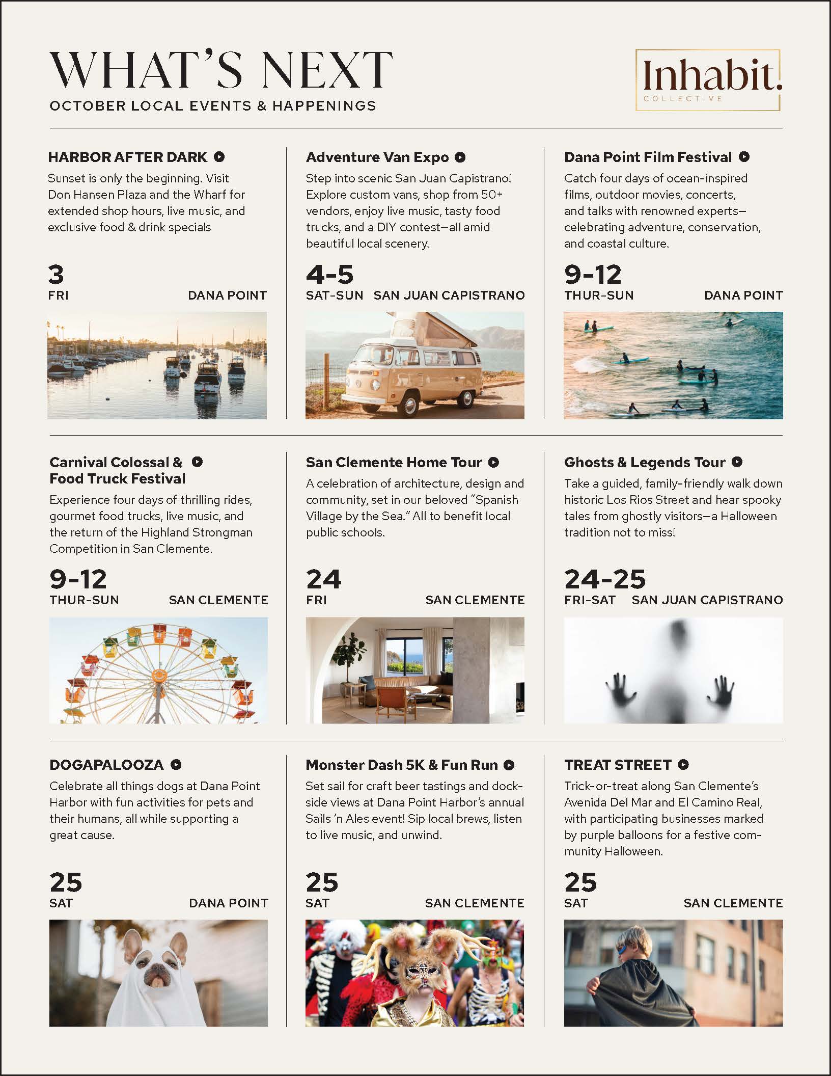 October brings cooler mornings, golden light, and a calendar full of reasons to step outside and connect. This month’s lineup includes everything from food truck gatherings and harbor nights to home tours, spooky traditions, and dog-friendly celebrations across Dana Point, San Clemente, and San Juan Capistrano.