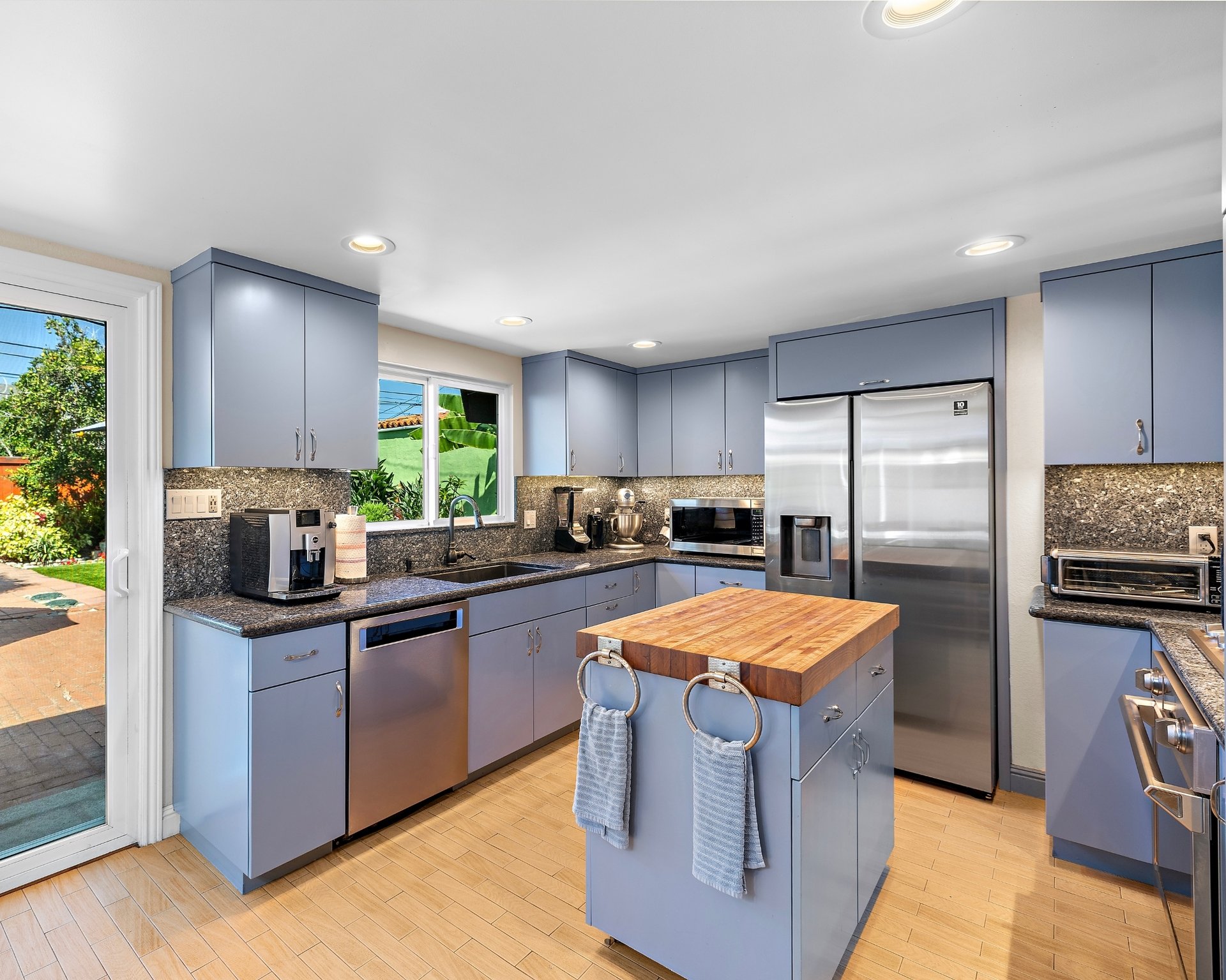 The original kitchen had great layout and natural light, but it felt boxed in by dark granite, mid-blue cabinets, and a busy visual rhythm.