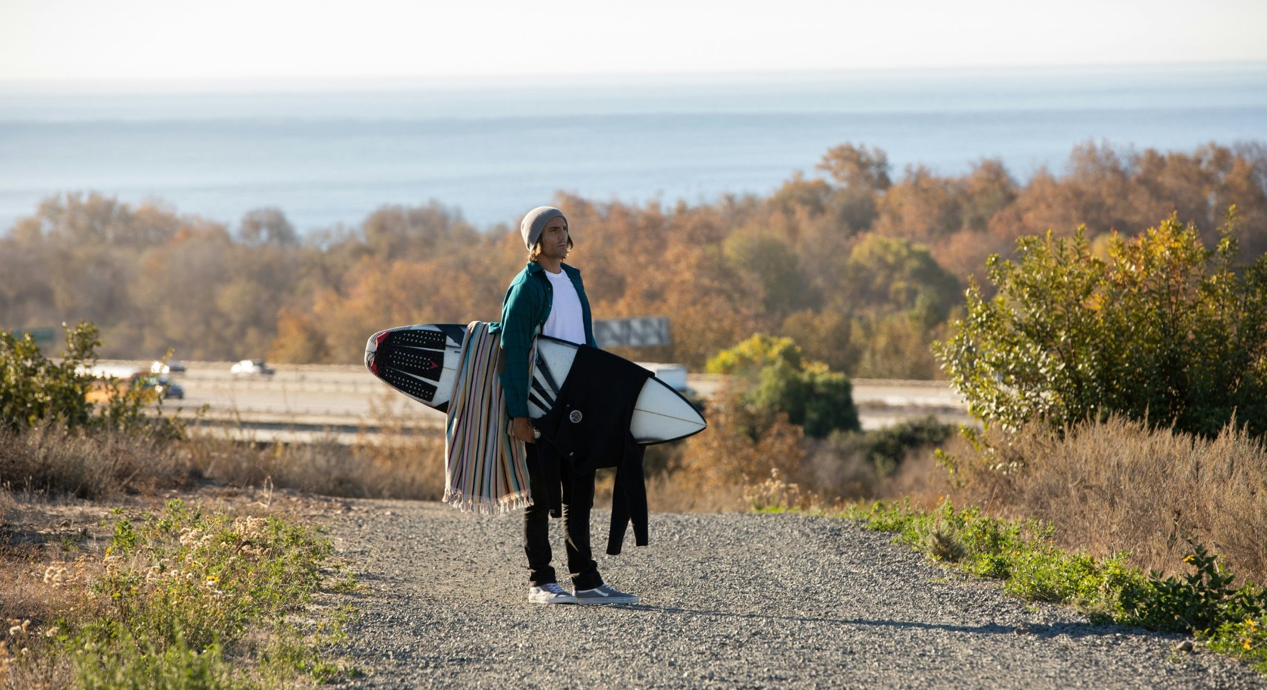 Along the way, surfers pass bikes, beachgoers, and the occasional train rumbling along the coastal tracks before the trail opens to the Pacific Ocean.